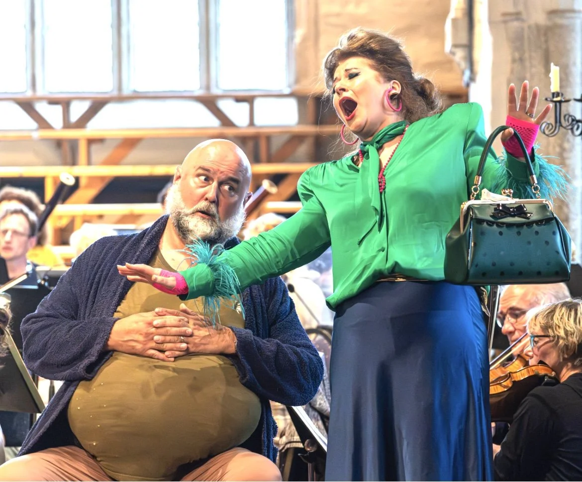 Madam Larina at bottom Nireland opera sept 2024 ( blonde wig) Cameron Menzies and Dominic Lindberg